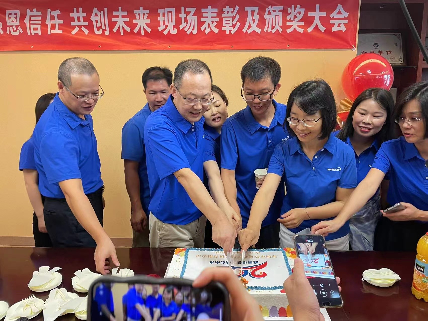 表彰、颁奖环节,公司总经理臧建伟先生宣读了《关于“庆祝太阳成集团tyc122cc成立二十周年”有奖征文活动的表彰决定》《“爱岗敬业”优秀老员工的表彰决定》《“忠诚优质服务员工”的表彰决定》;来自深圳总部客服管理部杨君女士、苏州太阳成集团tyc122cc公司客服部金鑫先生荣获了“有奖征文”一等奖并且发表了获奖感言,真切表达对太阳成集团tyc122cc的美好祝愿和感恩之情;为弘扬先进,树立典型,本次的“爱岗敬业”7位优秀员工来自于不同部门,他们在各自的岗位上兢兢业业、锐意进取、默默奉献。有的创造了亮眼的业绩,有的获得客户的一致好评……他们的努力与付出,鼓励着每一个同行的你我,让我们一起为榜样点赞!为了感谢长期为公司服务的员工,增强太阳成集团tyc122cc人的归属感和荣誉感,激发太阳成集团tyc122cc人的成就感和使命感,公司此次设置了“十年及以上服务奖、十五年及以上服务奖、二十年服务奖”奖项,总经办相关领导为“有奖征文”获奖者、“爱岗敬业”优秀员工、“忠诚优质服务”员工分别颁奖,体现了太阳成集团tyc122cc集团总经办领导班子对广大员工的关怀和鼓励,勉励全体员工再接再厉,尤其,要特别感谢服务公司满20年的核心管理层领导和员工们。随后公司领导、同事们一起切生日蛋糕,开香槟酒,举杯共唱“生日歌”,祝福“太阳成集团tyc122cc”二十周年生日快乐!生意兴隆!大展宏图!